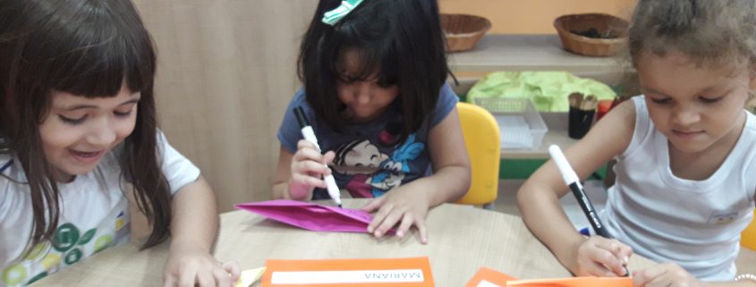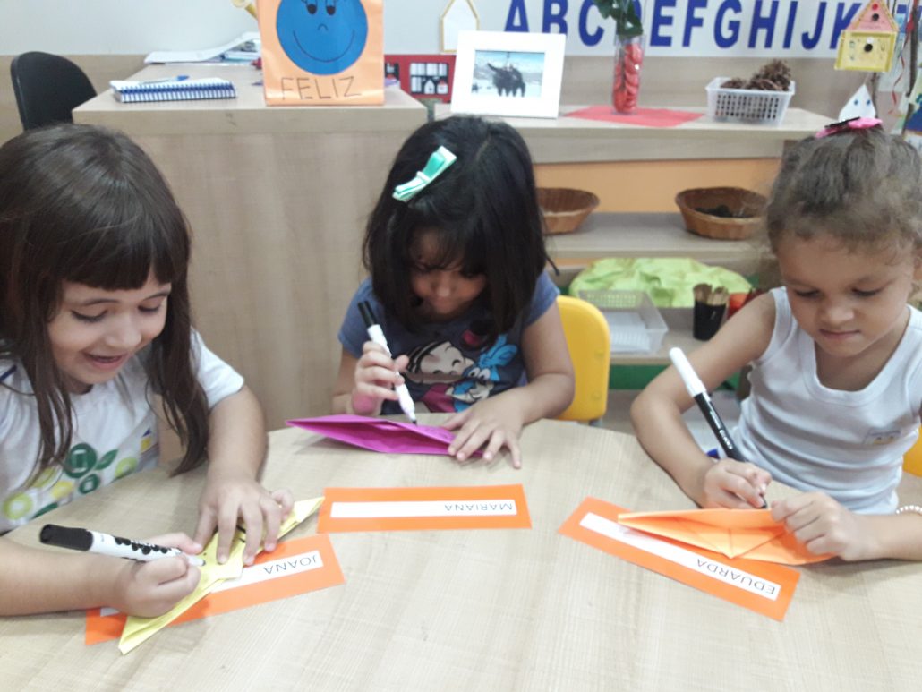 No Infantil I as crianças estão cada vez mais interessadas em escrever seu nome e o nome dos amigos. As professoras escolheram a música “A Canoa Virou” para que completassem o próprio nome e os nomes dos colegas, cantando e se divertindo. Nas aulas de Arte observaram nos livros lindos barquinhos e confeccionaram um para brincar.